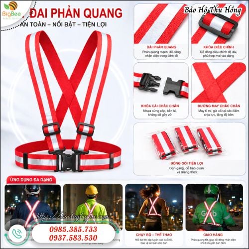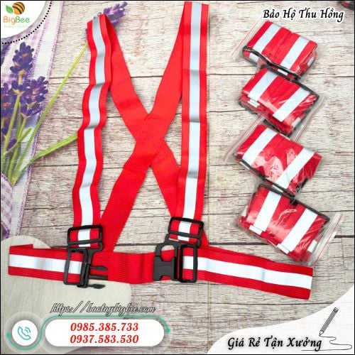 Dây áo phản quang (áo dây phản quang) là dòng sản phẩm thiết kế dạng dây đai chữ H phía trước và chữ X sau lưng, giúp ôm sát cơ thể và giữ cố định khi di chuyển. Phần dây có màu đỏ nổi bật kết hợp với dải phản quang màu xám chạy dọc, tạo hiệu ứng phản chiếu ánh sáng cực mạnh khi gặp đèn xe hoặc ánh sáng môi trường. Đây là yếu tố quan trọng giúp người sử dụng dễ dàng được nhận diện từ xa trong điều kiện thiếu sáng.